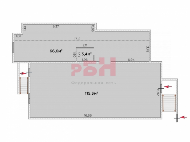 - 2 зала правильной прямоугольной формы, зона ресепшен, 2 входа, 2с/у;