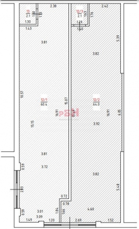 Помещение разделено на две обособленные площади (62.5 и 66.1 кв.м.), с санузлами и отдельными входными группами.